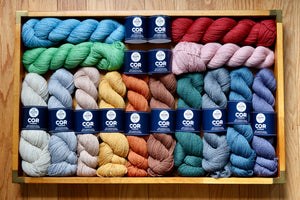 Our first yarn base is the result of a search for balance and a dedication to supporting a local, small-chain fiber economy. A perfect middle ground between Rustic and Refined; Soft and Strong; Delicate and Hard-wearing, COR is a 3-ply semi-worsted spun yarn made with a 50/50 blend of American Cormo and American Corriedale which comes in both a Worsted and a Fingering Weight.