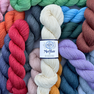 Our second yarn base continues our commitment to local sourcing and thoughtful blending, bringing together luster, softness, and strength in a uniquely American way. MerHair is a 2-ply DK weight yarn spun from a 70/30 blend of American Merino and American Mohair. Smooth and slightly airy, light yet warm, it offers a gentle halo while still allowing textured stitches to shine more clearly than you might expect from a mohair blend—perfect for cozy garments and dimensional knits alike.