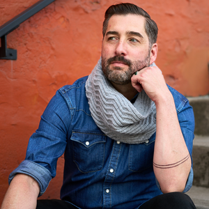 Circuitry is a beautiful infinity cowl with modern, traveling cabled lines that are reminiscent of a circuit board. Designed by Seth Richardson in COR Fingering.